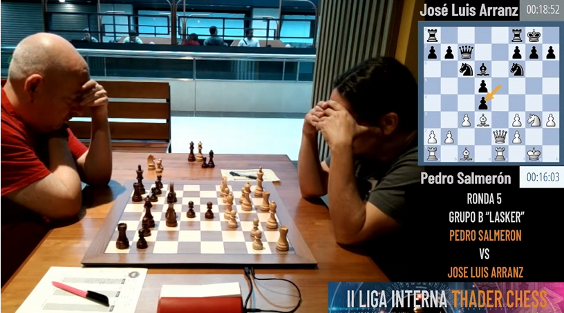 Partida en directo de la quinta ronda de la II Liga Thader Chess. Pedro Salmerón contra José Luis Arranz.