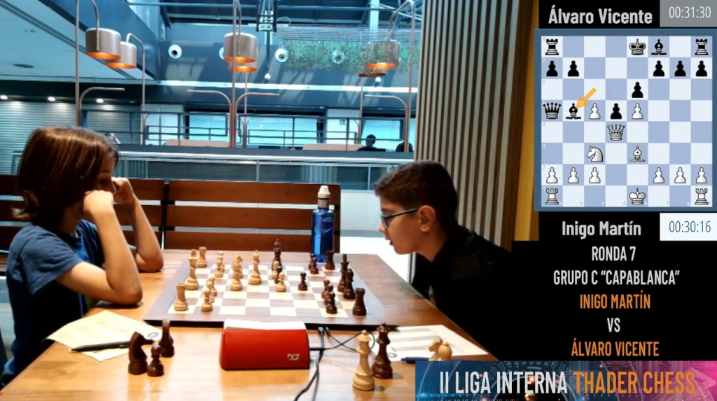 Partida en directo de la séptima ronda de la II Liga Thader Chess. Álvaro Vicente contra Inigo Martín.