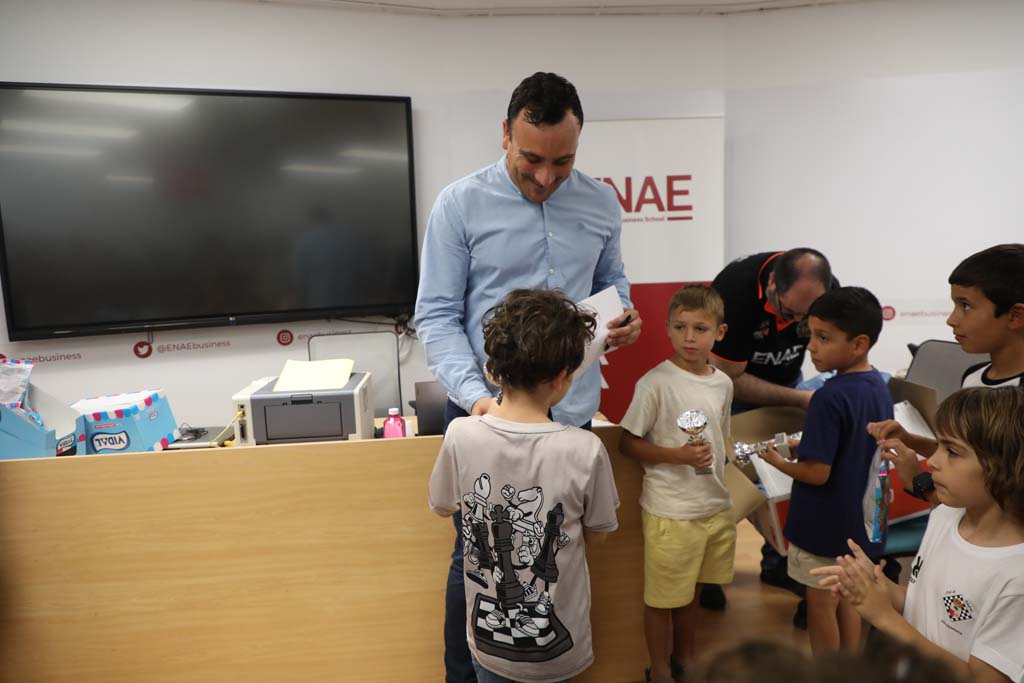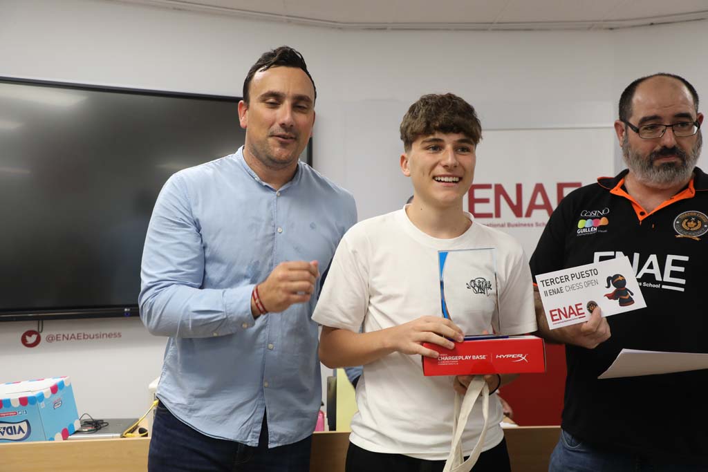 Al acabar el torneo se procedió a la entrega de premios y regalos, conducida por el anfitrión Pedro López Carreño, responsable de Empleo/RSC de ENAE e impulsor y coorganizador del evento. Para los más pequeños hubo trofeo para los tres primeros de cada categoría (sub-8/10/12/14), reloj de ajedrez para los primeros de cada una y regalo de chuches, cortesía de Vidal Golosinas, y camisetas con los personajes diseñados por Santi Ayala. Para los mayores, trofeo y premio en metálico para los 5 primeros clasificados; y trofeos, cargadores inalámbricos y bolsa de regalos ENAE para los de las categorías femenina, veterano, socio del club, sub-1700 y sub-1800.