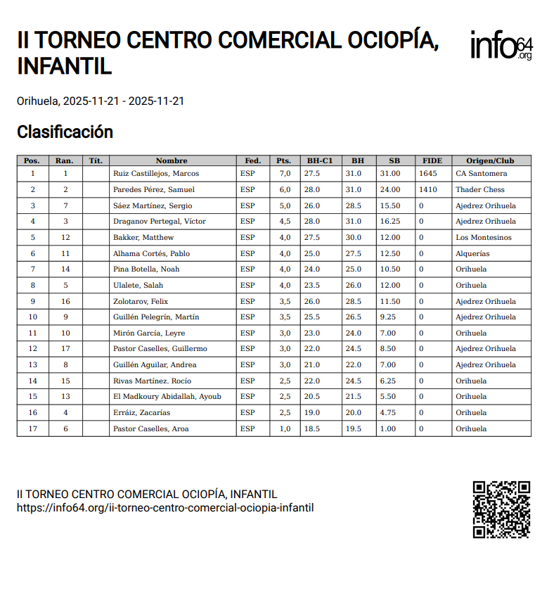 El torneo infantil fue para Marcos Ruiz Castillejos sin discusión con 7 victorias en 7 partidas, le siguió Samuel Paredes de nuestro club con 6 victorias y Sergio Sáez de Orihuela.
