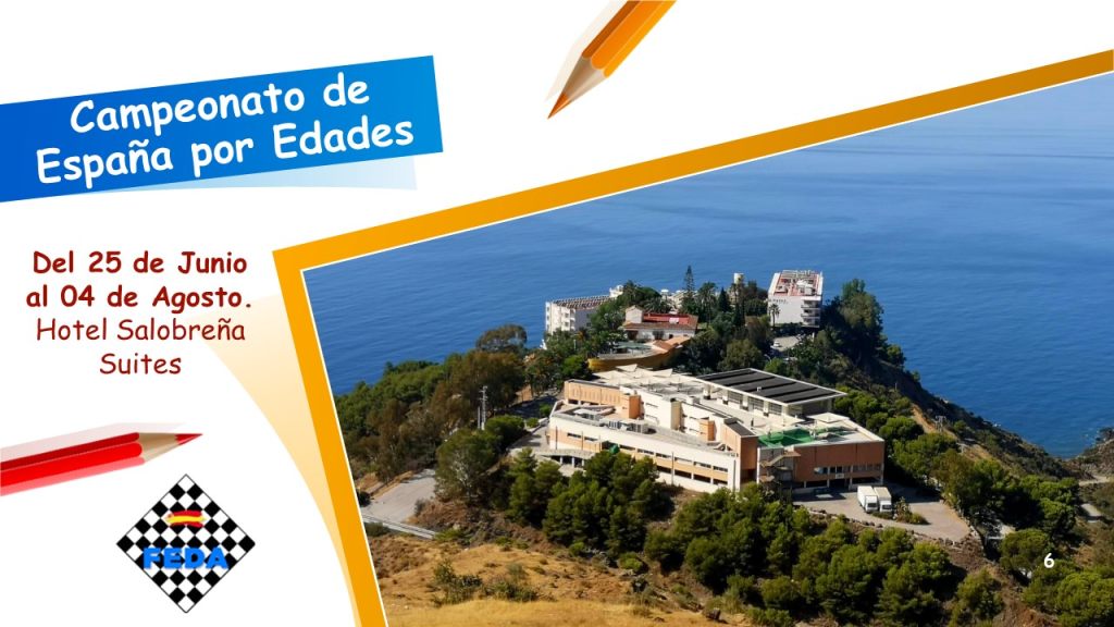 Abierto el plazo de inscripción para los Campeonatos de España de Jóvenes, Salobreña 2024. Organizados por la FEDA. Se disputarán dos modalidades, rápidas y estándar, con categorías desde sub-8 a sub-18. La FEDA tiene un convenio con el Hotel Salobreña para que los jugadores puedan reservar habitaciones para ellos y sus acompañantes a un precio más reducido que el habitual por la temporada alta.