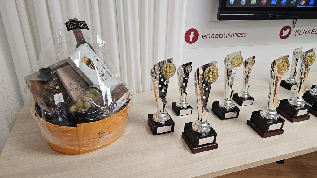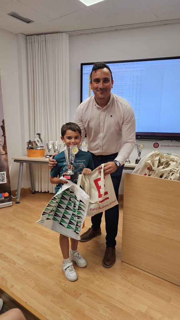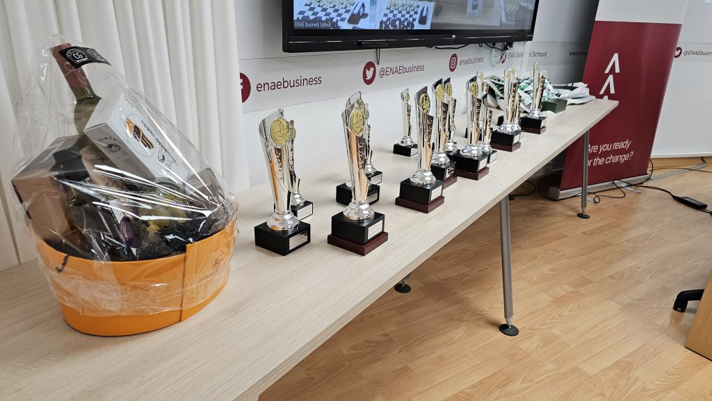 Al finalizar el torneo, se ha producido la entrega de premios y regalos, conducida por Pedro López Carreño, responsable de Empleo/RSC de ENAE e impulsor del evento y que está apostando decididamente por el ajedrez. Para los niños, aparte del trofeo a los 3 primeros de cada categoría, Pedro ha hecho entrega de libros y relojes de ajedrez cortesía de El Corte Inglés. Para los adultos trofeos a los 5 primeros clasificados, junto con los premios en metálico, y a la primera clasificada femenina. Todos, niños y adultos, obsequiados con una bolsa de regalos de ENAE. Como colofón al torneo se ha sorteado una Cesta Gourmet, que ha proporcionado El Corte Inglés, entre los participantes que ha ido a parar a Juan Carlos Muñoz de Thader Chess.
