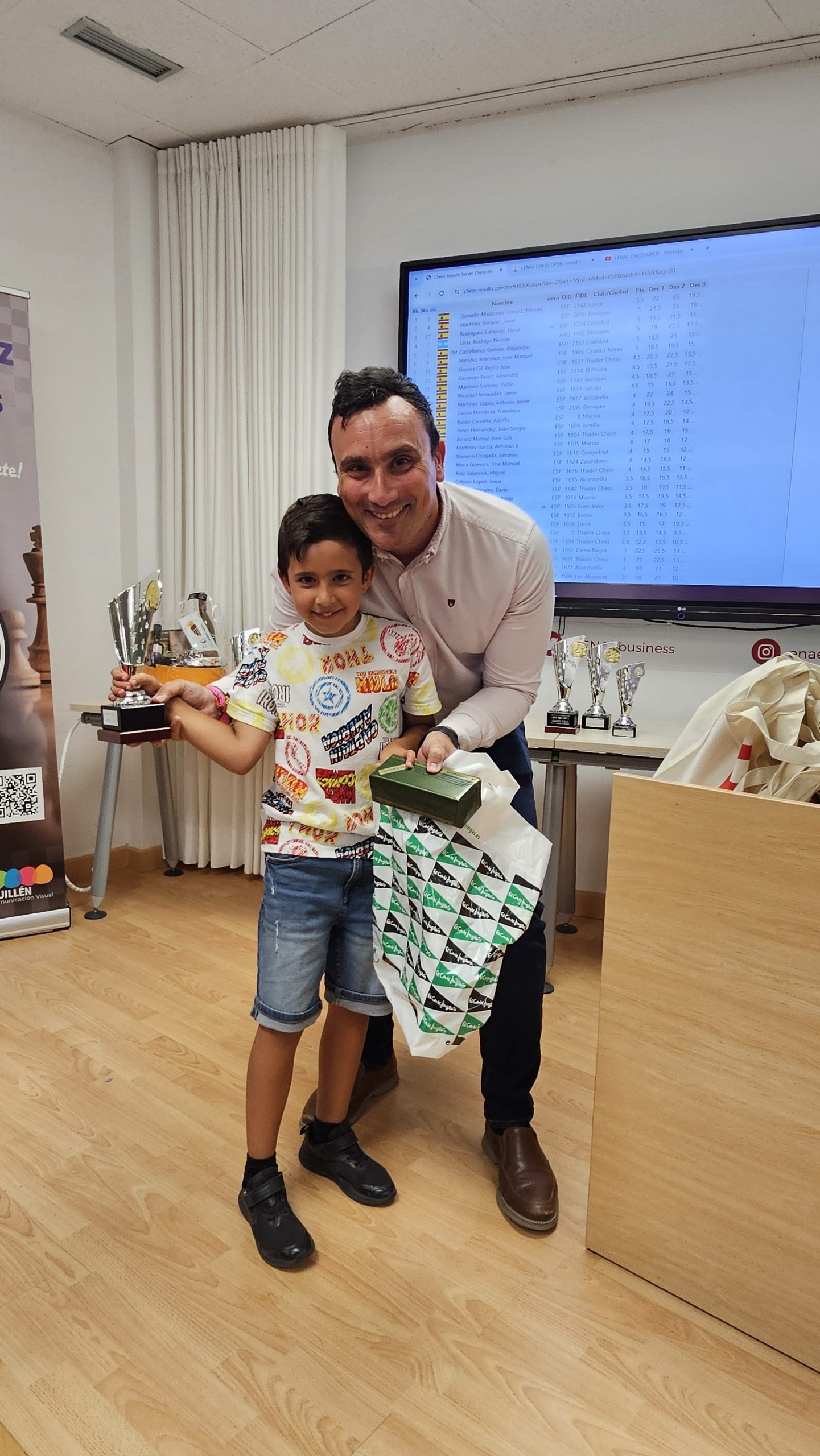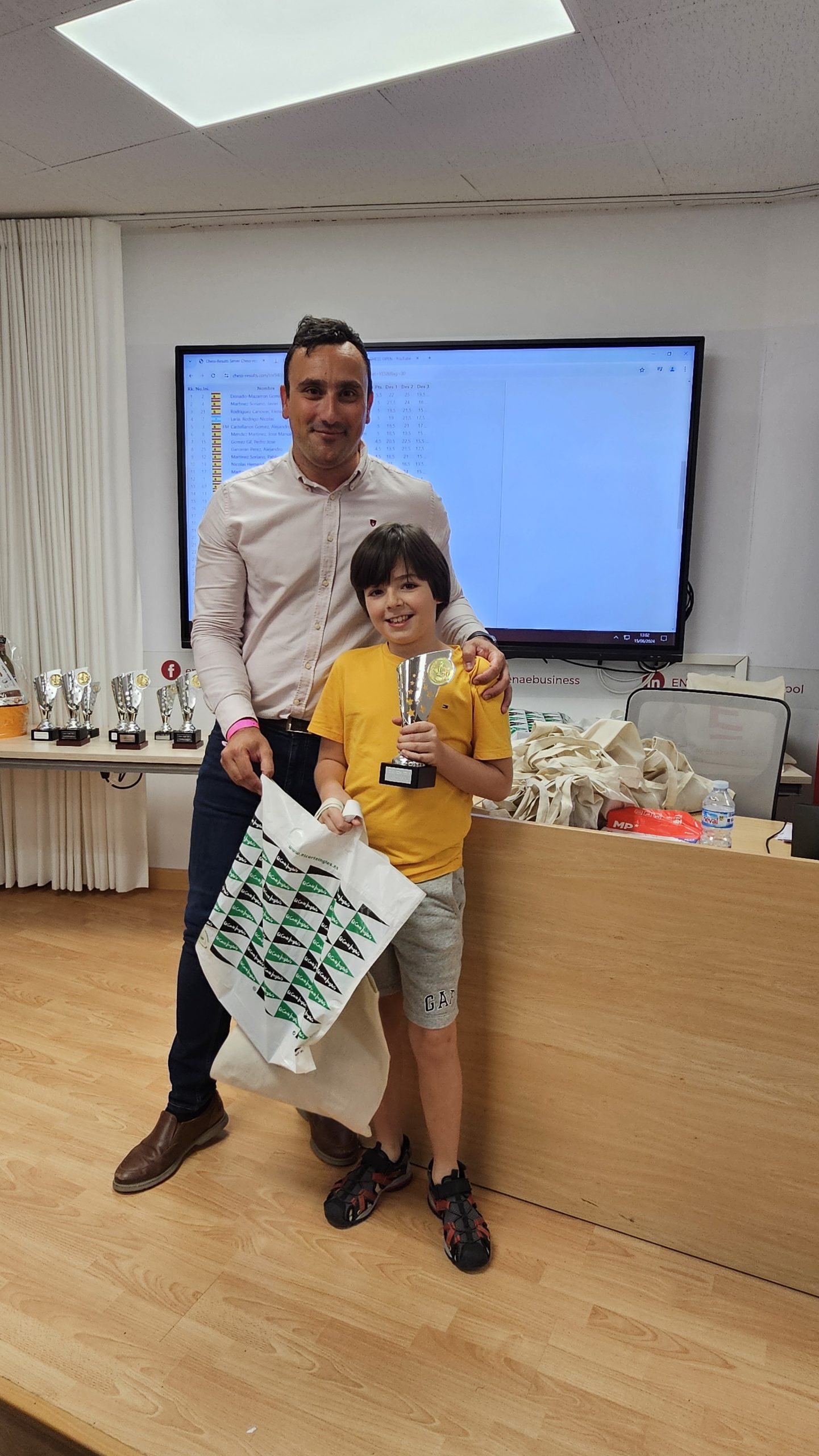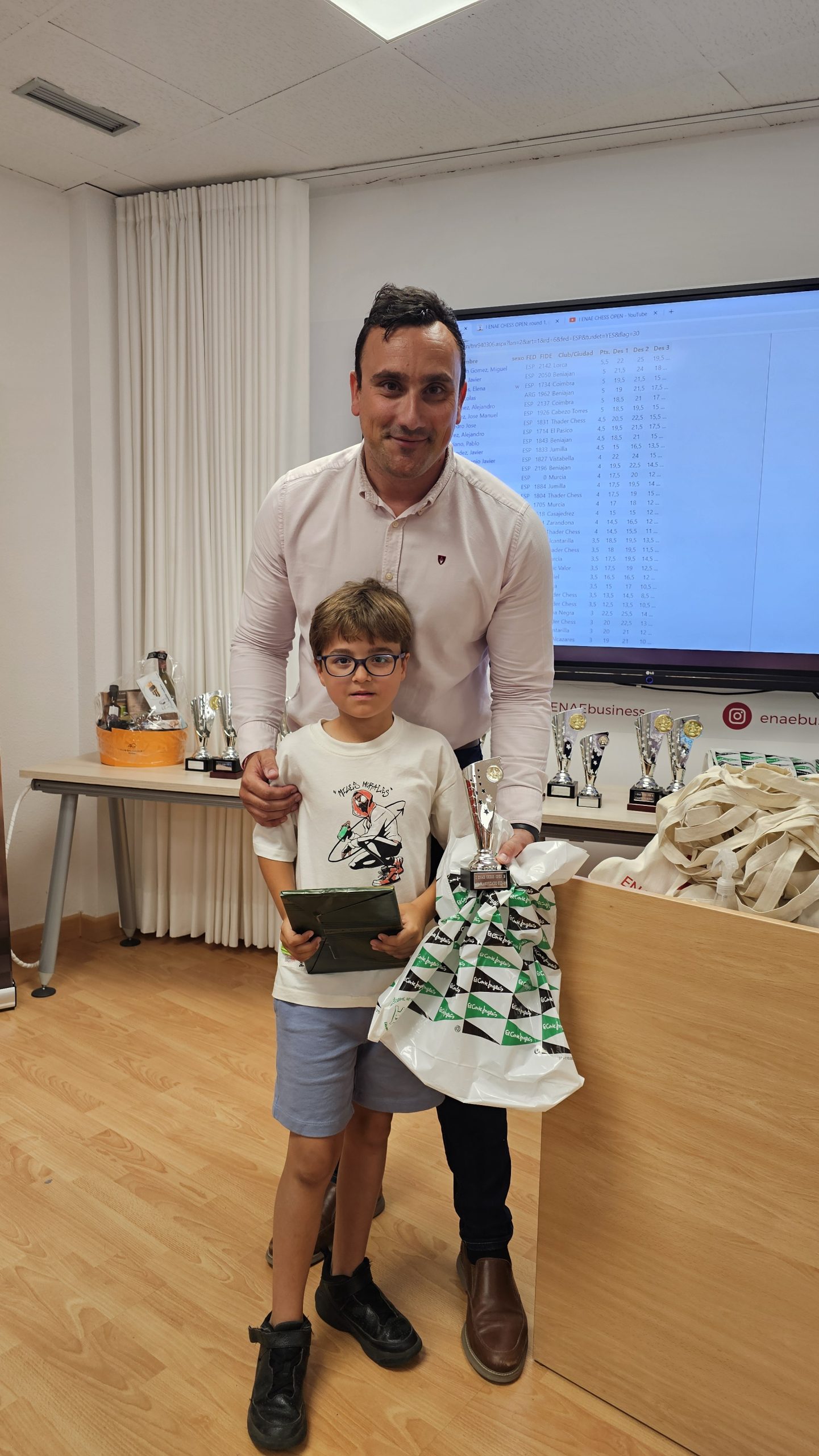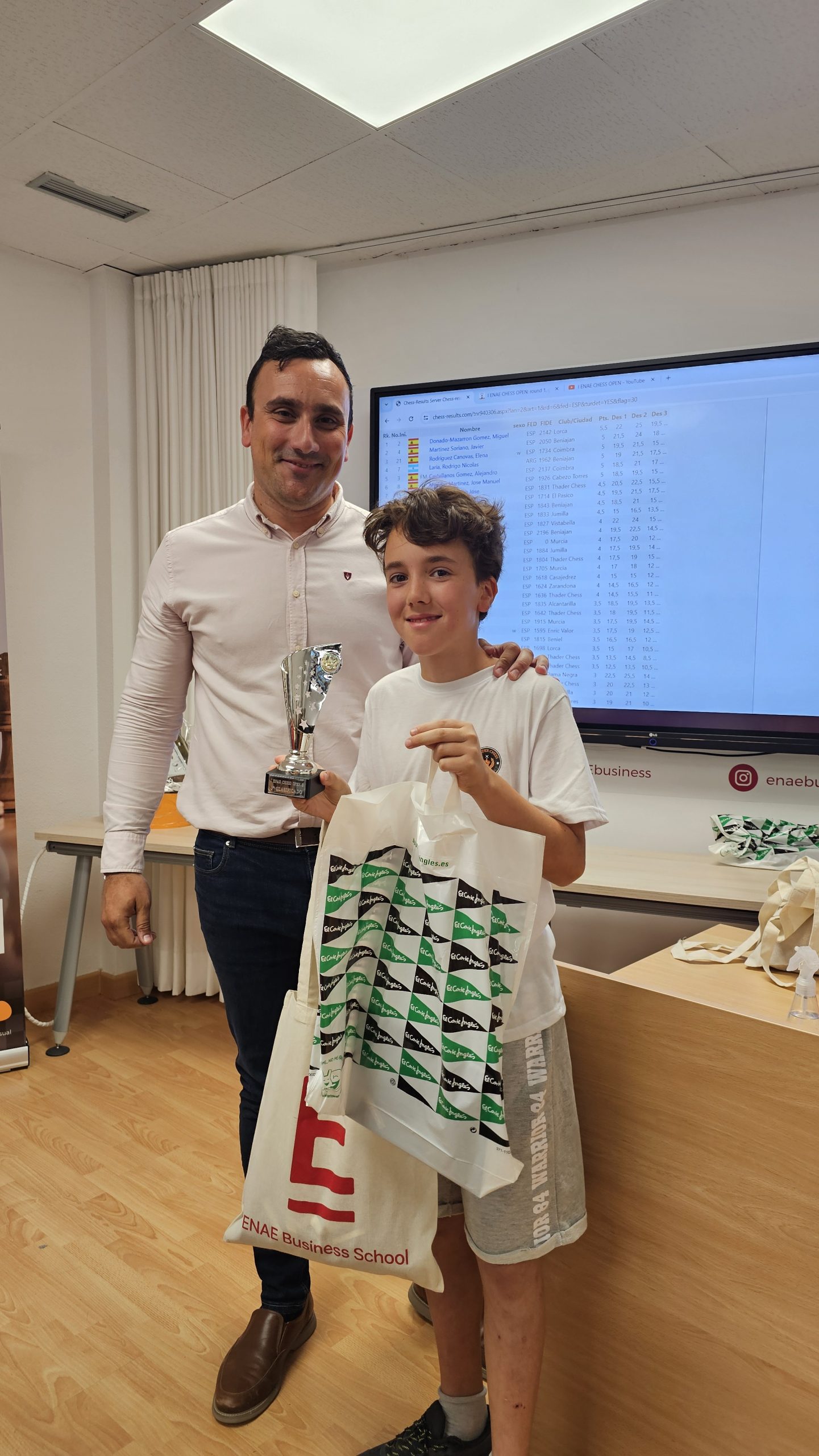 Al finalizar el torneo, se ha producido la entrega de premios y regalos, conducida por Pedro López Carreño, responsable de Empleo/RSC de ENAE e impulsor del evento y que está apostando decididamente por el ajedrez. Para los niños, aparte del trofeo a los 3 primeros de cada categoría, Pedro ha hecho entrega de libros y relojes de ajedrez cortesía de El Corte Inglés. Para los adultos trofeos a los 5 primeros clasificados, junto con los premios en metálico, y a la primera clasificada femenina. Todos, niños y adultos, obsequiados con una bolsa de regalos de ENAE. Como colofón al torneo se ha sorteado una Cesta Gourmet, que ha proporcionado El Corte Inglés, entre los participantes que ha ido a parar a Juan Carlos Muñoz de Thader Chess.
