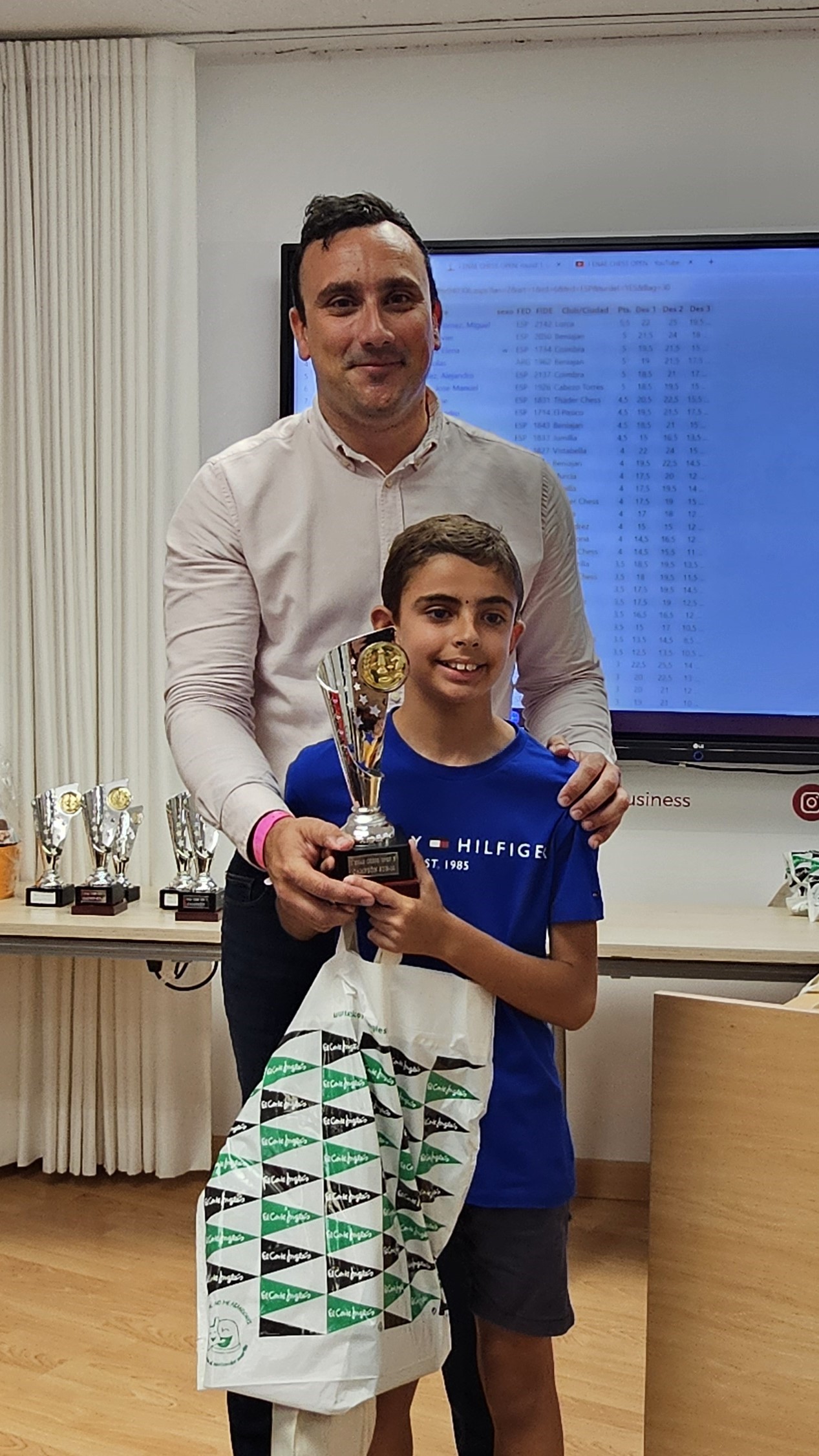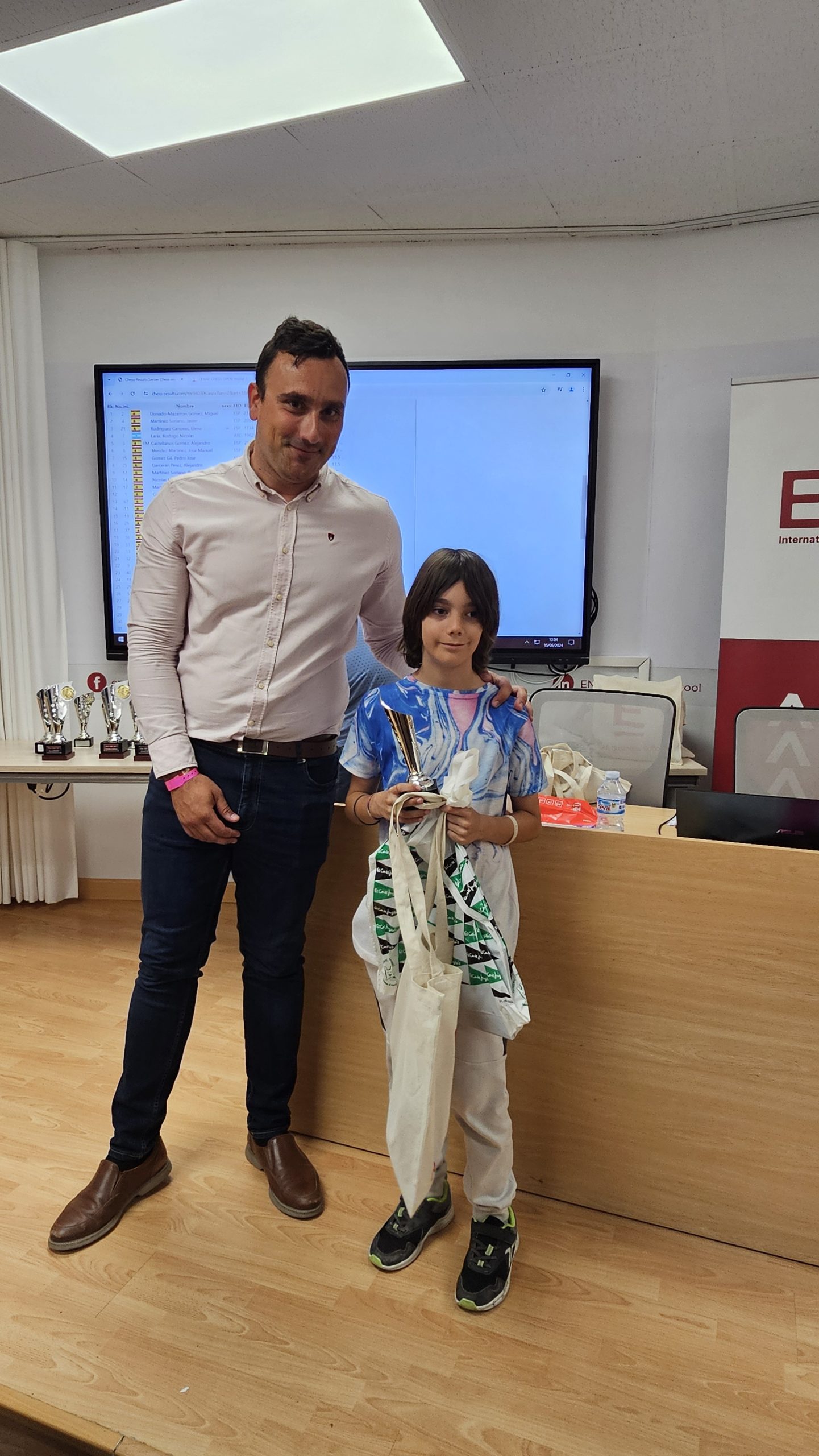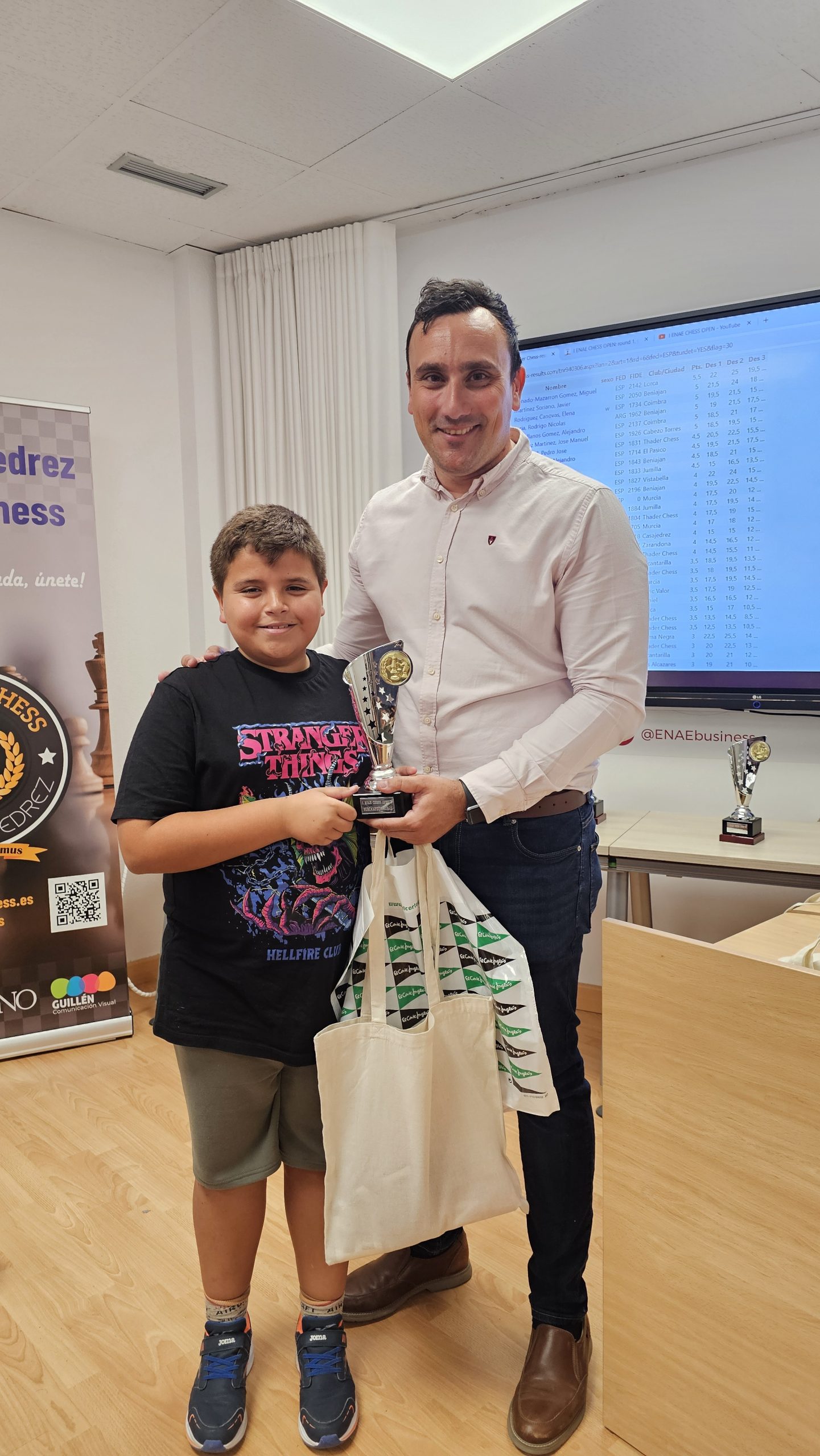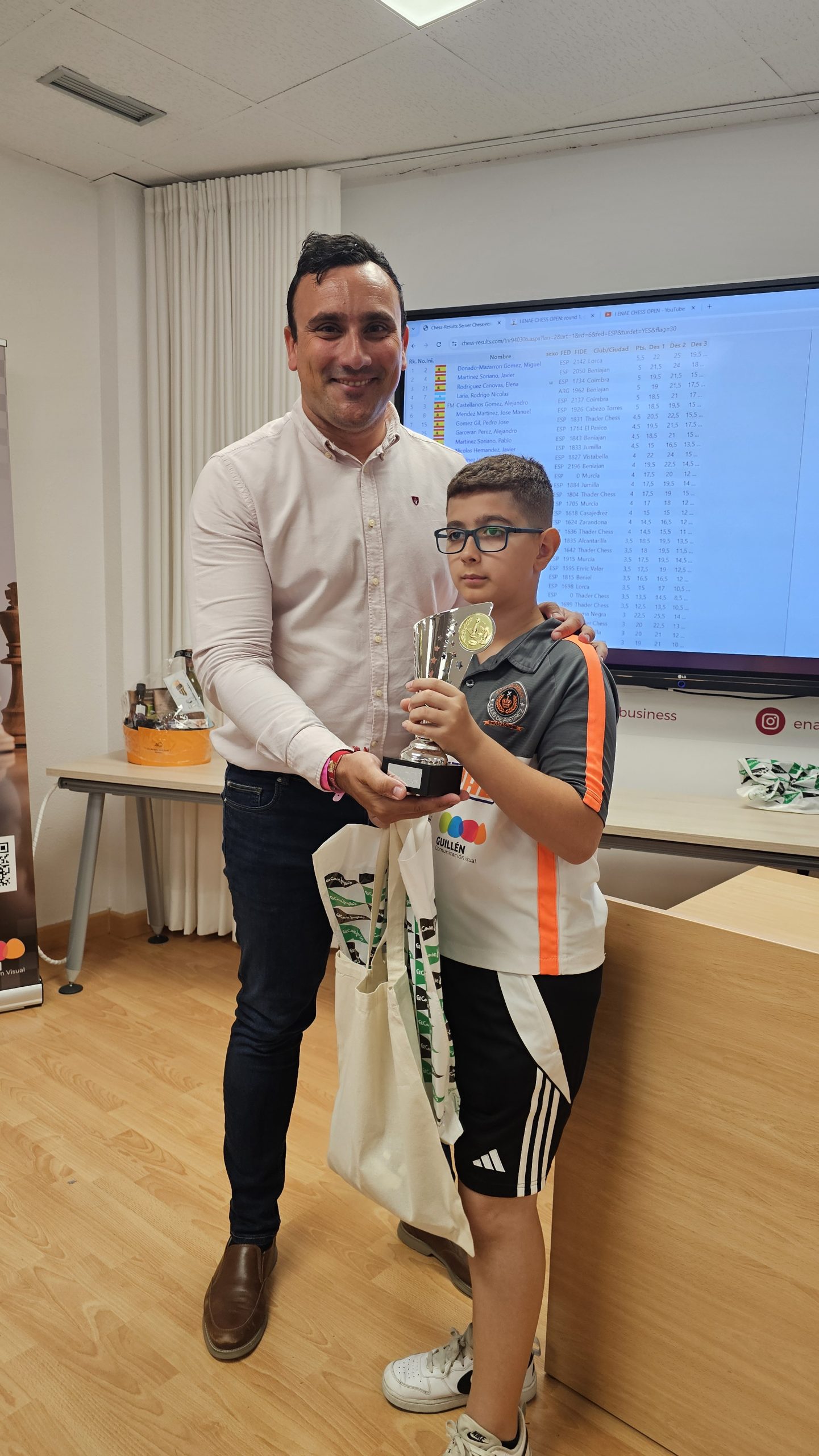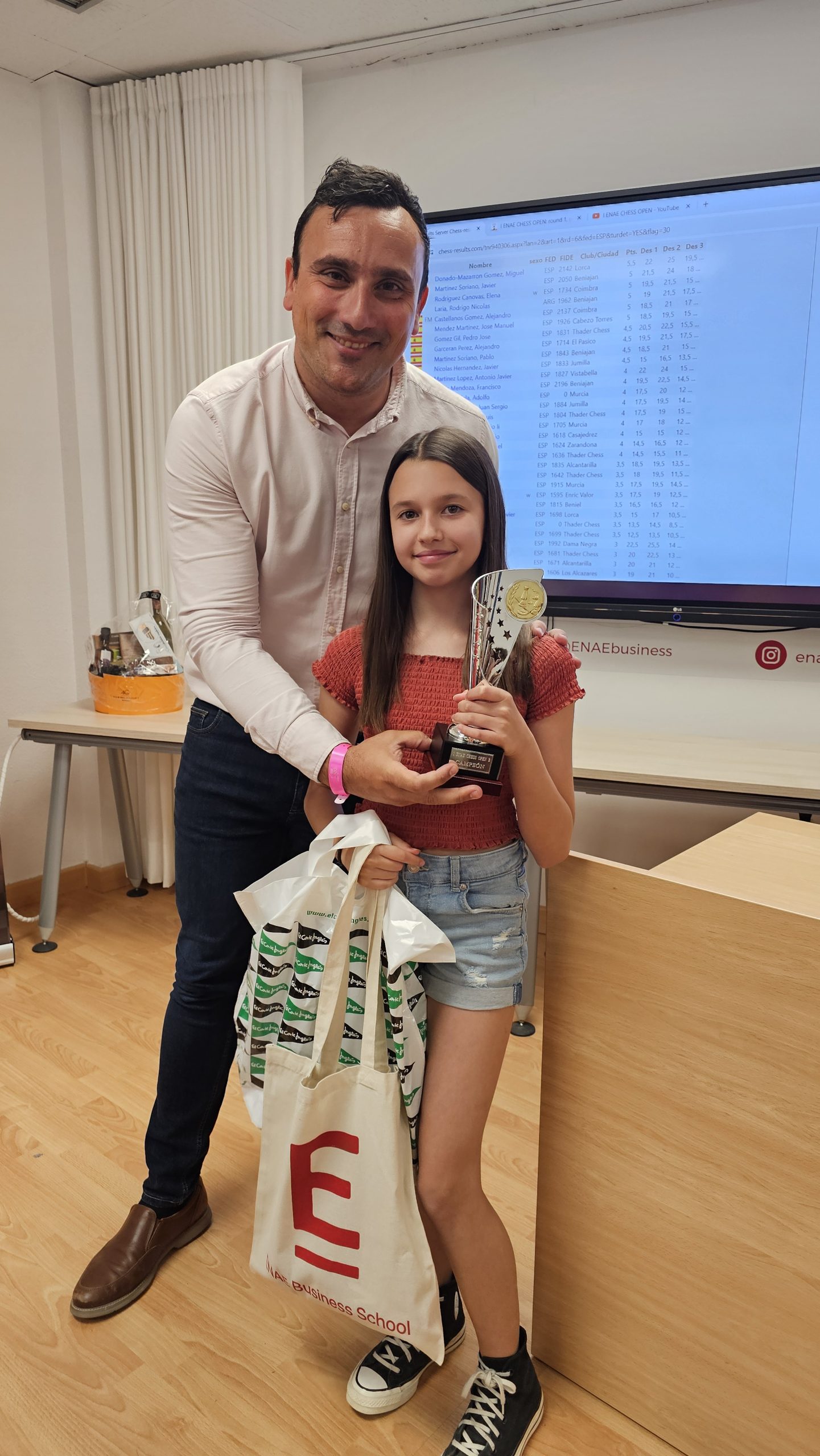 Al finalizar el torneo, se ha producido la entrega de premios y regalos, conducida por Pedro López Carreño, responsable de Empleo/RSC de ENAE e impulsor del evento y que está apostando decididamente por el ajedrez. Para los niños, aparte del trofeo a los 3 primeros de cada categoría, Pedro ha hecho entrega de libros y relojes de ajedrez cortesía de El Corte Inglés. Para los adultos trofeos a los 5 primeros clasificados, junto con los premios en metálico, y a la primera clasificada femenina. Todos, niños y adultos, obsequiados con una bolsa de regalos de ENAE. Como colofón al torneo se ha sorteado una Cesta Gourmet, que ha proporcionado El Corte Inglés, entre los participantes que ha ido a parar a Juan Carlos Muñoz de Thader Chess.