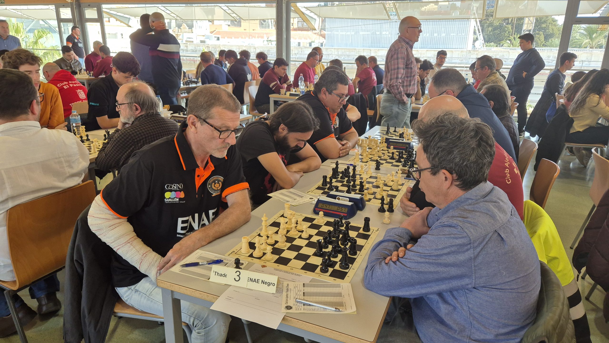 Thader Chess ENAE Blanco se enfrentaba con Zarandona Chaquetera “B” y terminó con un empate a 2. Thader Chess Casino Gastrobar ganó su encuentro por incomparecencia de su rival Beniaján Titanes. Y por último, Thader Chess A.V. San José consiguió una victoria por 3 a 1 contra E.C.A. Casino de Abarán que no pudo subir a la clasificación por cometer una alineación indebida.