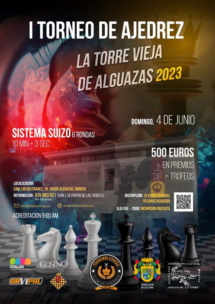 Con el apoyo del Excmo. Ayuntamiento de Alguazas el Club de Ajedrez Thader Chess tiene el honor de organizar el I Torneo de Ajedrez “La Torre Vieja de Alguazas 2023” el próximo 4 de Junio.