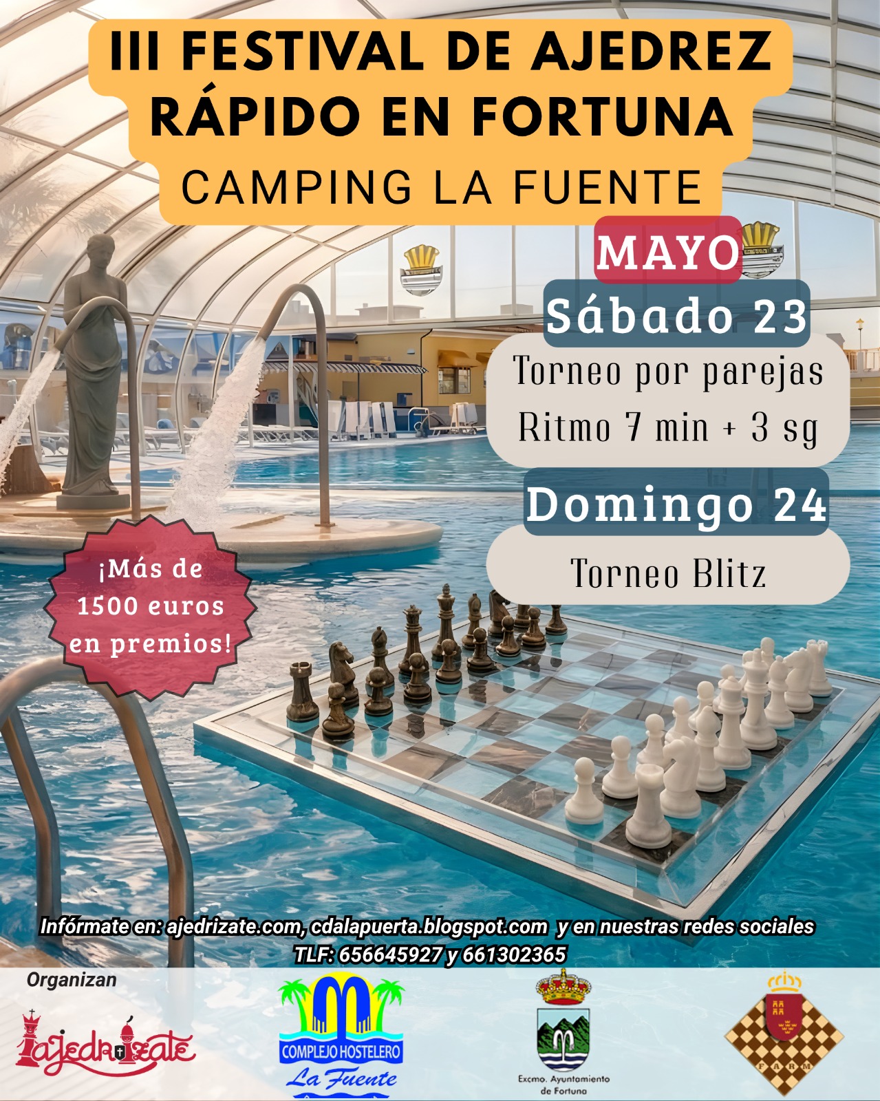 El III Festival de Ajedrez rápido de Fortuna se disputará en formato de dos torneos de ajedrez rápido (modalidad Blitz), ambos torneos se celebrarán en las magníficas instalaciones del Camping La Fuente en Baños de Fortuna, donde los jugadores y acompañantes pueden pasar un magnifico fin de semana. El III Torneo de parejas se disputará el sábado 23 de Mayo durante la tarde, y el III Torneo de ajedrez blitz se disputará durante la mañana del domingo 24 de mayo.