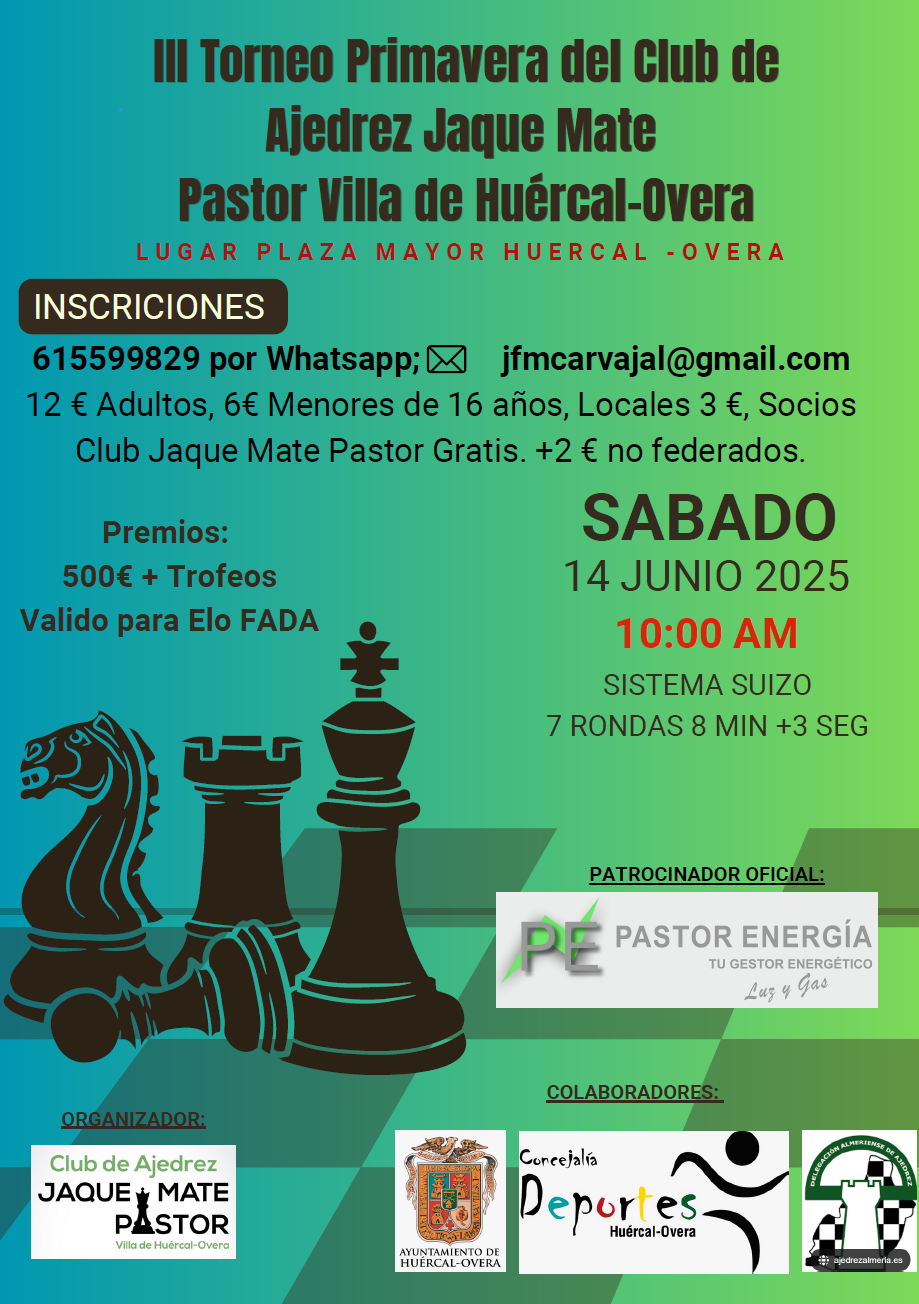 adultos, 6 € menores de 16 años e inclusive, 3 € jugadores locales, grastis socios del Club Jaque