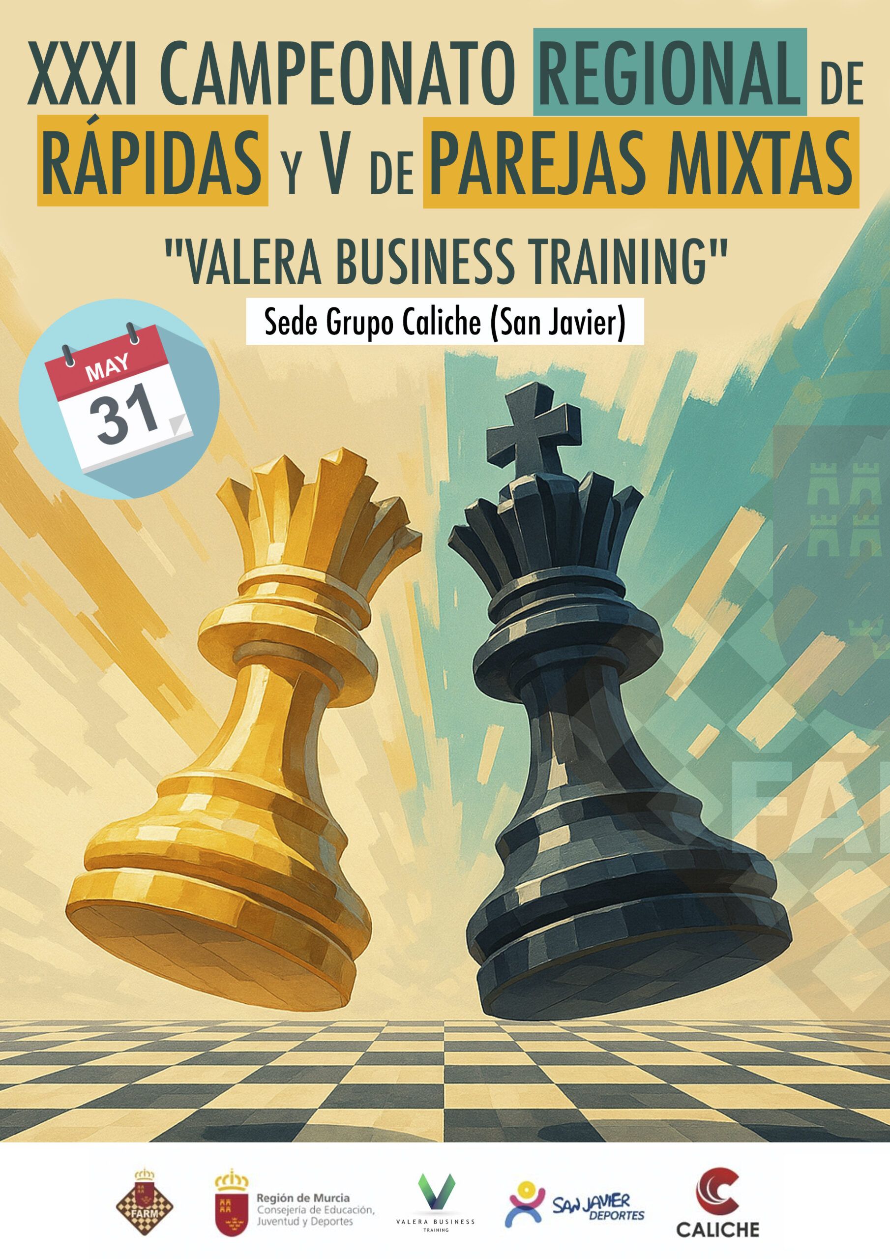 Organizado por la Federación de Ajedrez de la Región de Murcia, en colaboración con Valera Business Training, Dirección General de Deportes de la Comunidad Autónoma de la Región de Murcia y Grupo Caliche, se convoca la XXXI Edición del “Valera Business Training” (Campeonato Regional Absoluto de Ajedrez Rápido y V Campeonato Regional por Parejas Mixto).